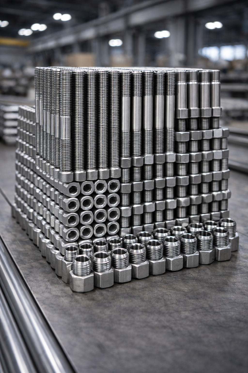 Svorníky celozávitové, so závitmi na oboch koncoch s hladkým driekom, šesťhrannou hlavou a svorníkové matice podľa výkresu alebo v zmysle noriem: ČSN / STN / EN / ISO / DIN / ASME / ASTM